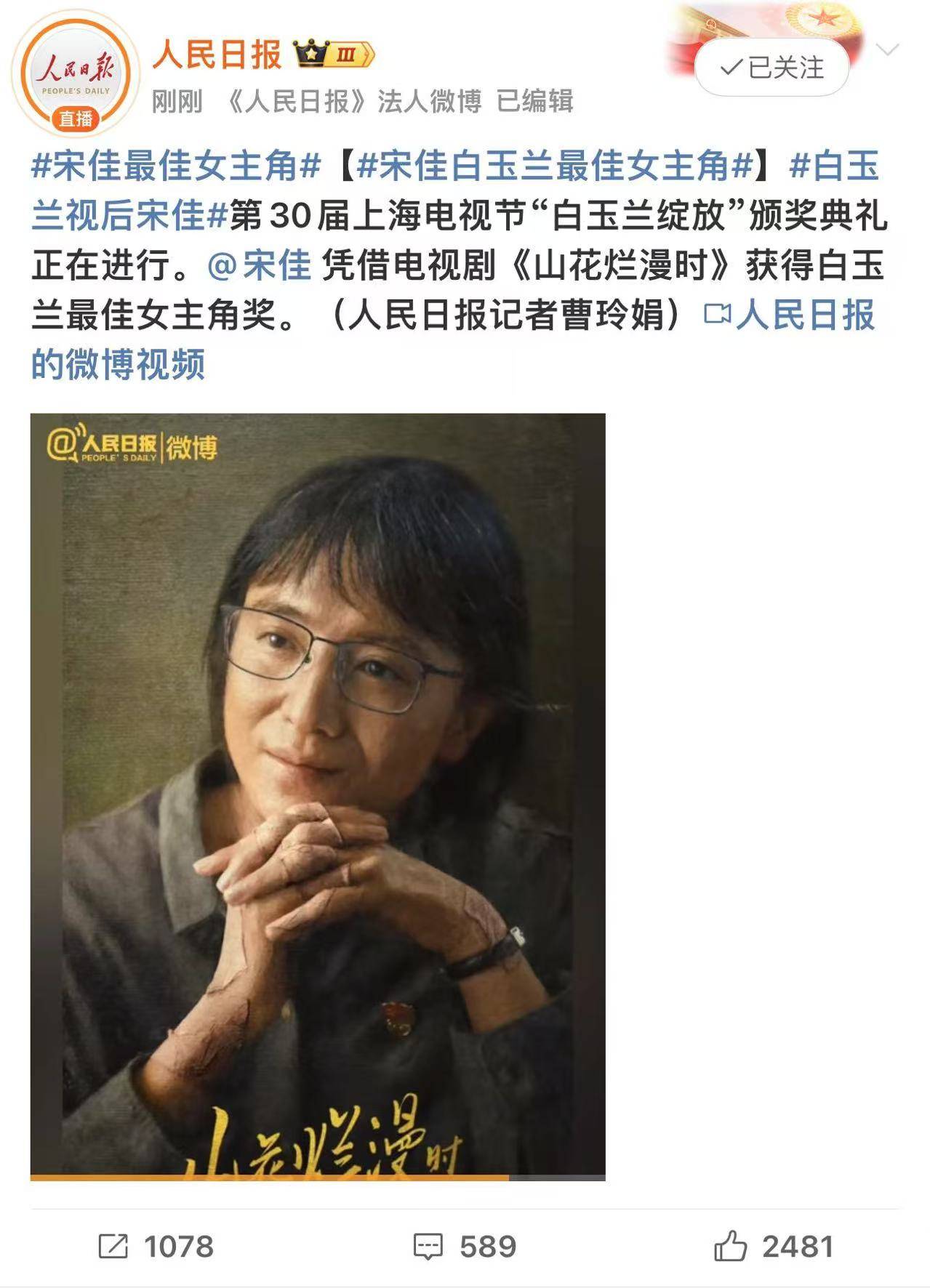 最终宋佳拿奖才算平息了争议,最实至名归毫无争议。但关于白玉兰奖视后的讨论和争议发酵,依然在继续。