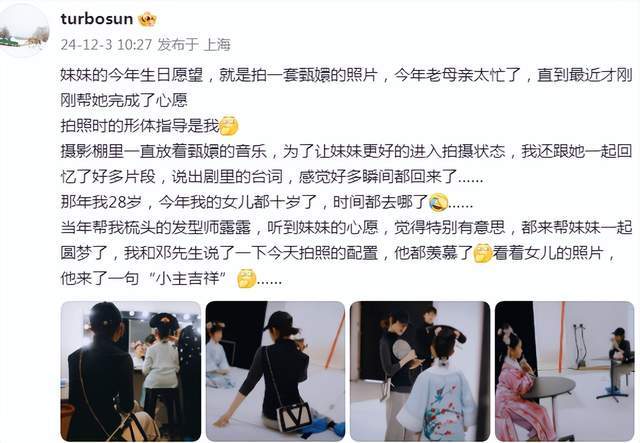 从孙俪晒出的照片来看,她不仅亲自陪着女儿去拍摄,而且,为了更好的帮妹妹进入拍摄状态,拍照时孙俪还担任起形体指导,并跟着女儿一起回忆《甄嬛传》中的片段,母女俩一起说剧里的台词,对此一幕,孙俪感慨称:“感觉好多瞬间都回来了。”