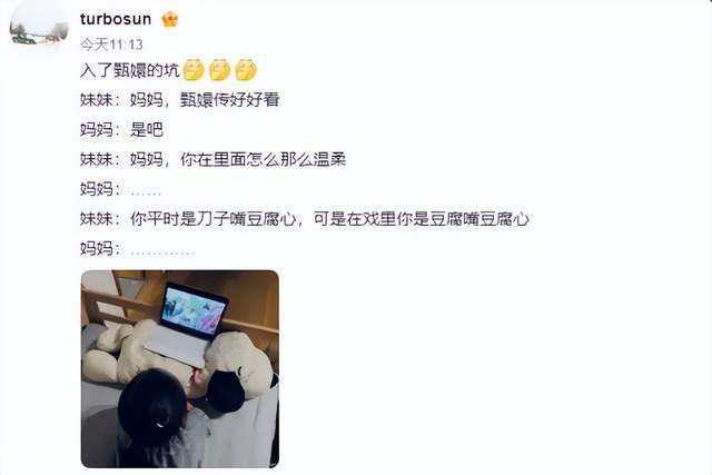 不仅网友喜欢,就连孙俪女儿都成为剧迷,早前孙俪就曾发文透露小花妹妹在追《甄嬛传》,而且,已经至少看了三遍。
