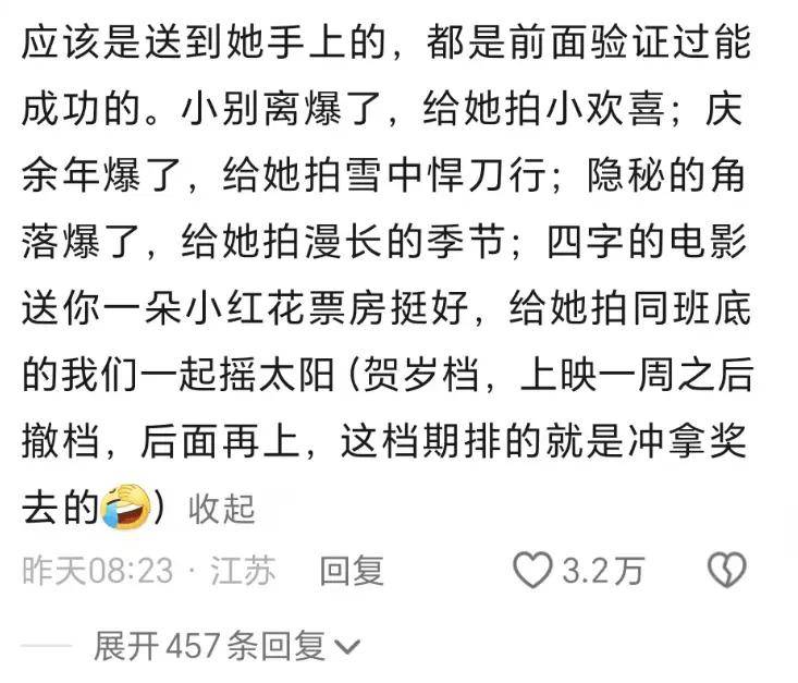 属于是什么题材爆火,徐静蕾就给她接什么题材,搭档的也都是圈内顶级的演员,这样的资源,放在任何一个人身上都得爆火,只是还要反过来否认自己的资源咖身份,就不怪吃瓜网友逆反了。