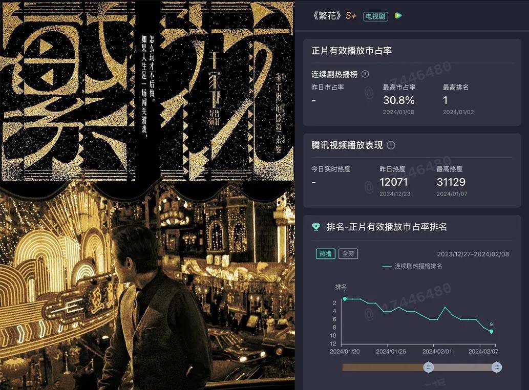 《繁花》(Blossoms Shanghai)由腾讯视频出品,最高市占率为30.8%,最高热度为31129。以20世纪90年代的上海为背景,围绕阿宝等一众人物展开,通过他们在商海的沉浮,展现了那个时代的繁华与变迁,以及人与人之间复杂的情感纠葛和利益纷争,描绘了一幅生动的上海风情画。