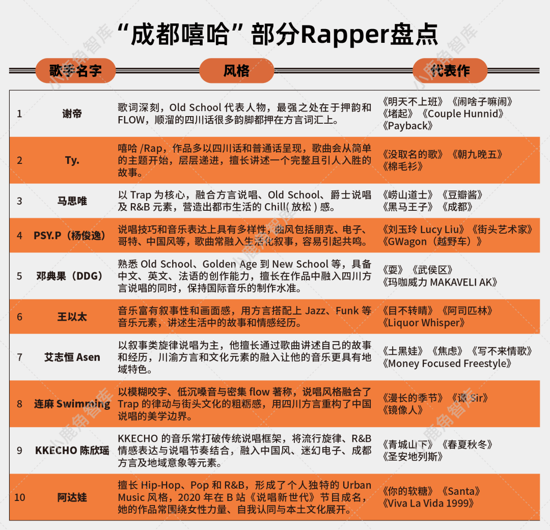 在成都说唱史的版图上,Big Zoo成立于2006年,由成都最早一批说唱元老创立,随后是Ty.、李随、ANSR J等一批人,用更成熟的flow与方言韵脚,将成都话的市井烟火气刻进韵律,2014年,谢帝更以一首《明天不上班》登上中央电视台《中国好歌曲》打破圈层,让川味说唱真正走向主流视野,他们均属于成都第一代说唱群体;而紧随其后的第二代成都说唱群体,如Melo、PSY.P(杨俊逸)、马思唯和孟子等,借Trap浪潮与国际化视野,带着厂牌说唱会馆红遍国内外;时至今日,艾志恒Asen、王以太、连麻Swimming、隼JinJiBeWater、YOUNG建坤、KKECHO陈欣瑶、阿达娃等第三代新锐,以多元化的音乐实验与先锋态度,正延续着成都说唱生生不息的创造力。