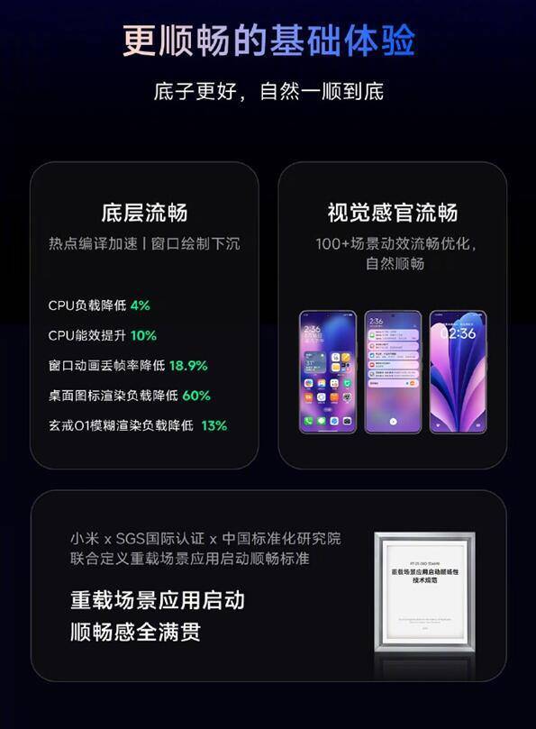 而在米粉最关注的性能方面,澎湃OS3着重对底层进行深度打磨,通过热点编译加速、窗口绘制下沉等技术手段,实现了CPU负载降低了4%,且CPU能效提升10%,窗口动画丢帧率降低18.9%,桌面图标渲染负载降低60%,而自研玄戒O1模糊渲染负载降低13%