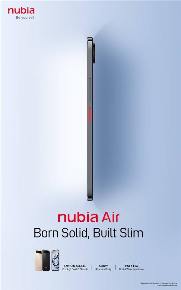 配置上努比亚Air采用6.78寸1.5K屏幕,屏幕表面覆盖康宁大猩猩玻璃7i,支持IP68、IP69防水防尘,处理器是紫光T800,8G+256G的起步内存,后置5000万三摄,前置2000万镜头,支持NFC和红外,系统是轻度定制的安卓15,定位是一款千元机