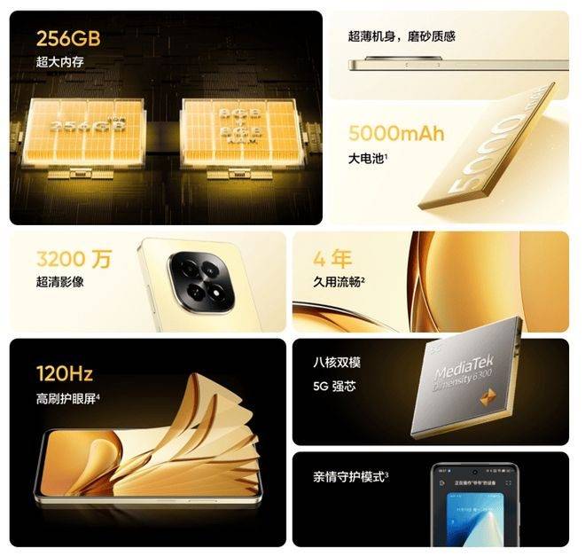 后置3200万的超清相机,其它方面湿手触控,3.5毫米耳机接口,外置SD卡扩展也都有,对了该机还支持IP64防水防尘,也是目前最最便宜的防水手机,没有之一了。而在系统上,真我的机子我好几台,明显感觉realme UI要比澎湃好用太多了,流畅度优化啥的都比较给力,真我V60也是上了5.0的安卓14完整版,安全补丁和功能都没阉割