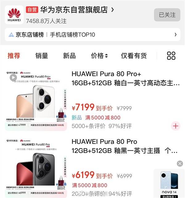 所以就在今天华为某东的自营旗舰店显示,Pura80 Pro/Pro+两款机型近日开启了优惠活动,满5000-800元。这两款机型原本定价是6499元起,也就是全版本都能享受800元优惠,到手价只有5699元。要知道,华为Pura 80 Pro/Pro+在6月14日才刚刚开启首销