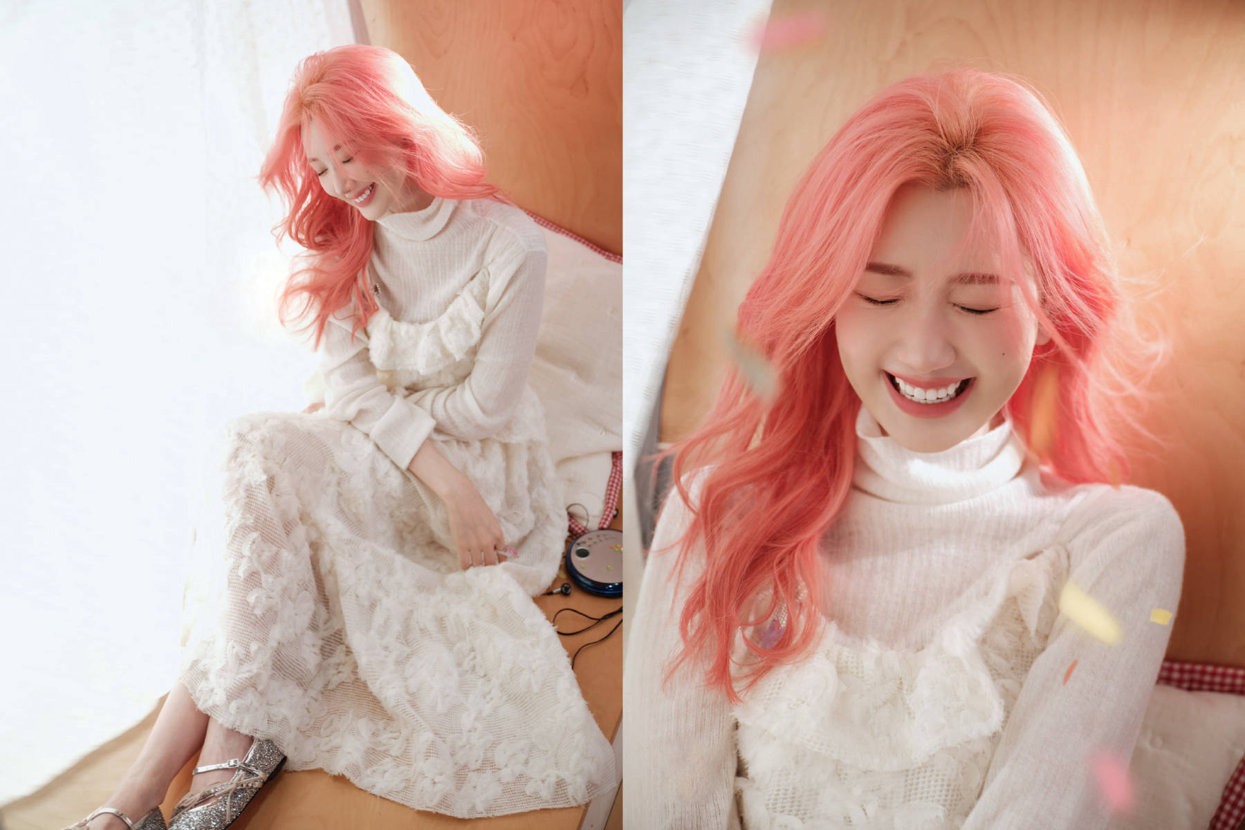 妆容搭配清透精致,与整体甜妹造型相辅相成。底妆通透细腻,凸显出皮肤的原生美感,没有厚重感,尽显清透质感;眉形柔和自然,贴合脸部轮廓,增添了几分温婉感;眼妆清淡却有神,淡淡的粉色眼影搭配纤长的睫毛,让眼神更加灵动,尽显甜妹本色;唇色选用水润的粉橘色,与粉色卷发相互呼应,既提升了气色,又凸显了娇俏可爱,整体妆容甜而不腻,简约而精致。